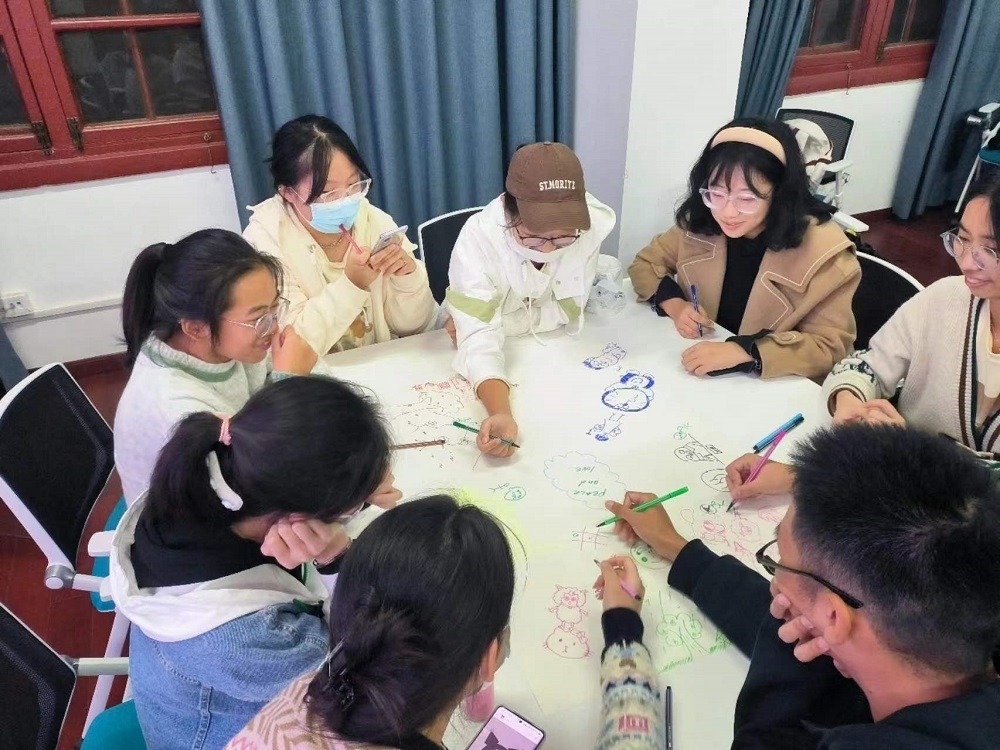 随后,老师为同学们发放纸笔,进行团体作画活动:先由各小组讨论,确定创作主题,同学们可以讨论交流彼此的看法,最终每组确定一个主题,由组内成员共同在纸张做出与该主题相关的图画。同学们纷纷在纸上画出自己的奇思妙想,与组内同学交流作画的意图,并派出一名小组成员向其他同学展示和总结组内同学的画作。每位同学都对此活动表现出了极大的兴趣,认真作画和倾听他人展示,进行展示的同学也能过生动形象地表达了本组同学的想法,并与在场很多同学进行互动,活动气氛十分融洽。