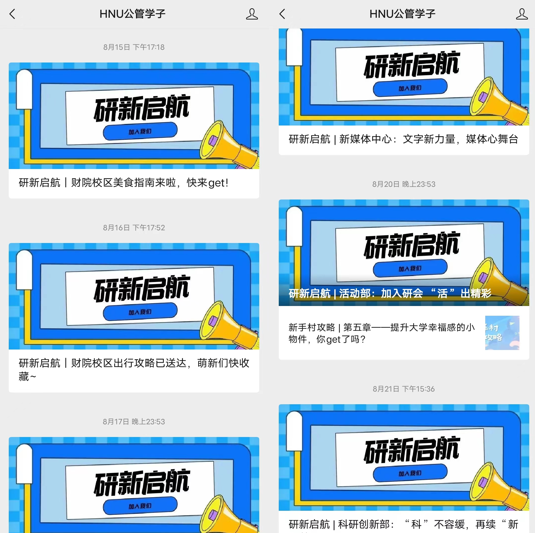 在暑假期间通过“HNU公管学子”微信公众号,推出了“研新启航”栏目,发布第一会所