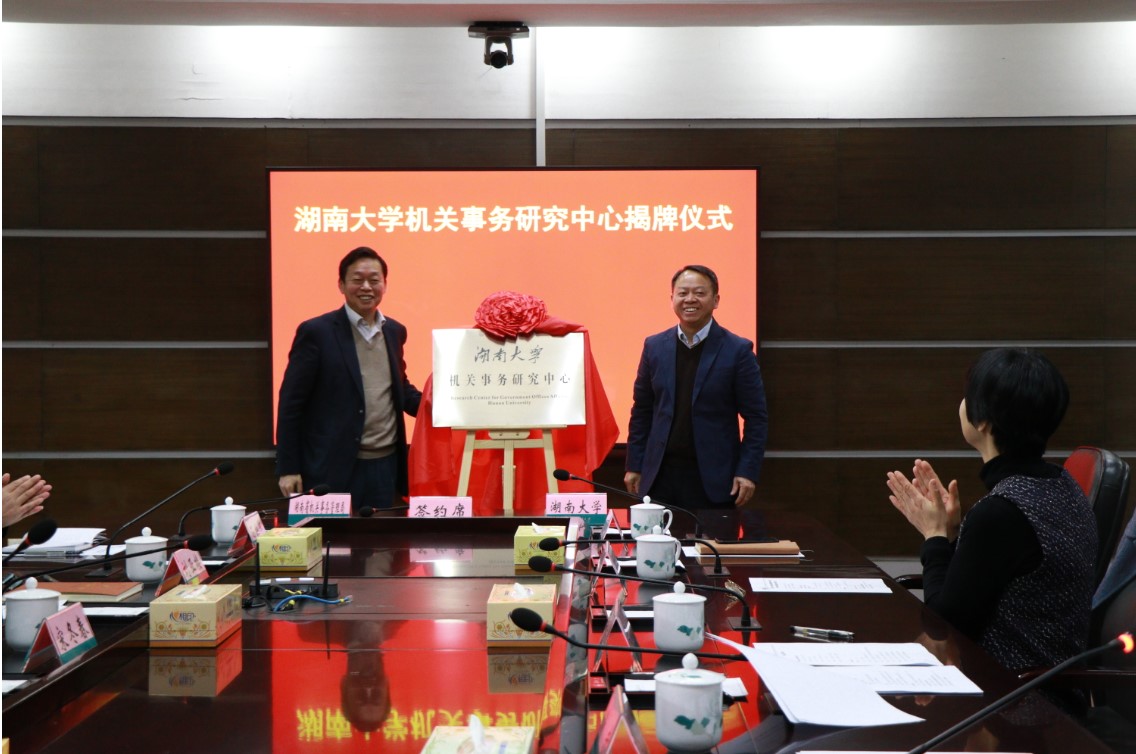 党委书记付蓉芬、湖南省机关事务管理局局长宋冬春、政策法规处处长石维军见证签约。随后,段校长和宋局长共同为机关事务研究中心揭牌,并发表讲话。