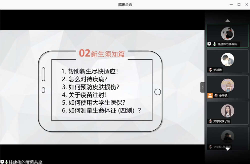 的校园生活、长沙的气候饮食等,树立“既来之,则安之,战胜之”的心态,知道对待疾病的正确态度、掌握预防皮肤损伤的正确方法、明白疫苗注射的重要性、了解使用大学生医保的方法和途径,以及学会如何测量“四测”生命体征:测体温、测脉搏、测呼吸、测血压。桂院长对于新生须知篇的详细讲解,解答了新生在入学前的大部分困惑,对新生的入学适应以及健康生活有着极大的帮助。