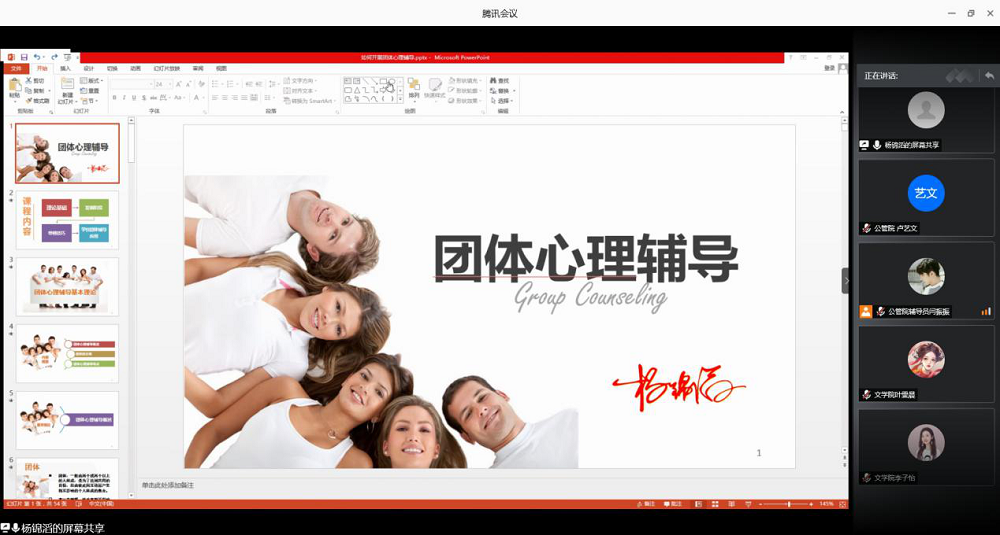 杨锦滔老师以“团体心理辅导”为题,从理论基础、发展阶段、带领技巧、第一会所