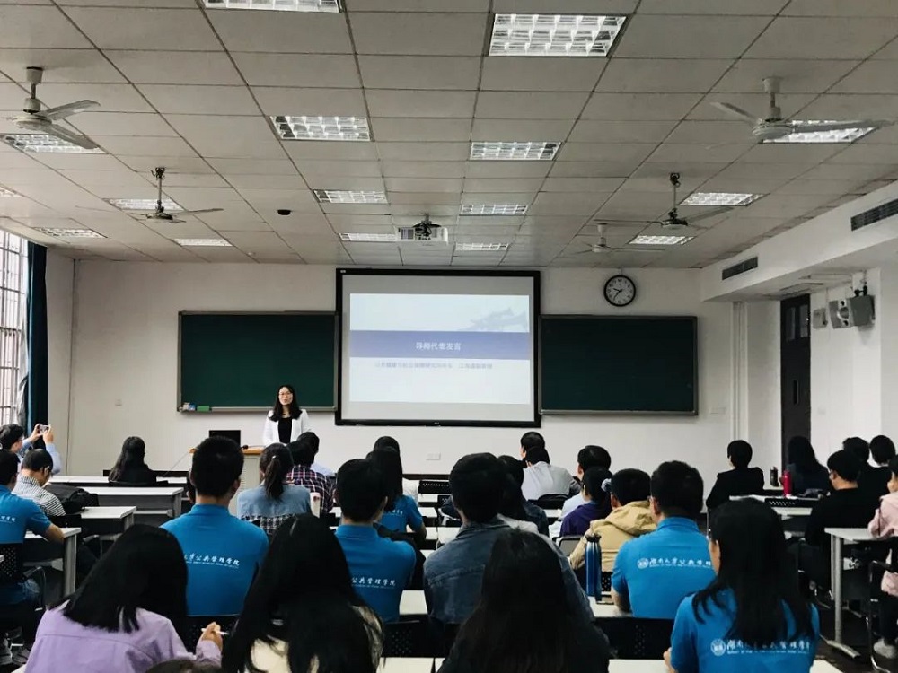 公共健康与社会保障研究所所长江海霞副教授作为导师代表发言,提出了三个问题给同学们思考:一是为什么学?江老师希望同学们能够理顺自身读研与求职规划、职业规划和人生规划的关系。二是要学什么?江老师认为同学们应该建立合理的知识结构、掌握研究方法和技能以及学会做科研。三是该怎么学?江老师提出要做好目标管理、时间管理、知识管理以及心理管理。最后,江老师祝愿每一个同学毕业时回首自己的三年时,都能拥有不后悔的底气!