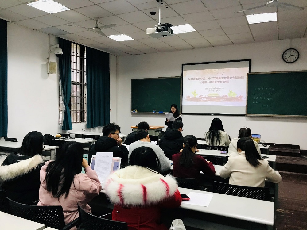 研究生会副主席黄家晨带领大家学习校党委常委、副校长汪卫斌以及校团委书记曹镠在第二十二次研究生代表大会上的讲话精神,并提出大家要认真贯彻本次会议的精神,加强自身建设,全心全意服务广大同学。
