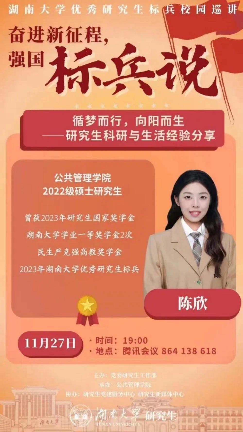 2022级硕士研究生陈欣以“循梦而行,向阳而生”为主题,就研究生科研与生活经验等内容进行了线上分享,第一会所