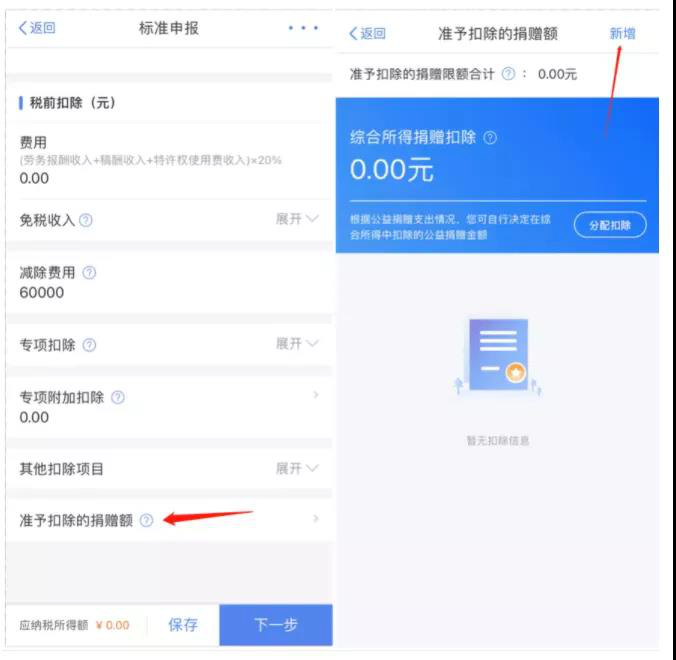 4. 一次可填写一张捐赠票据,如您有多张捐赠票据,请依次填写并“保存”。保存后继续“新增”,待全部捐赠票据登记结束后,即可进入下一步。所有捐赠票据信息输入完毕后,在页面选择“分配扣除”,填写“综合所得捐赠扣除金额”,点击“保存”即可。