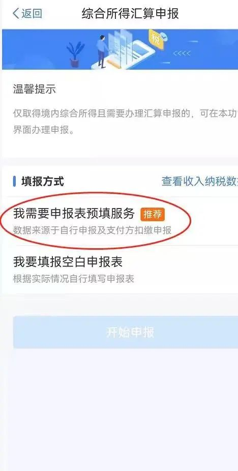 1.进入个人所得税APP第一会所,在【常用业务】栏目点击【综合所得年度汇算】进入,选择“我需要申报表预填服务”。